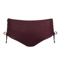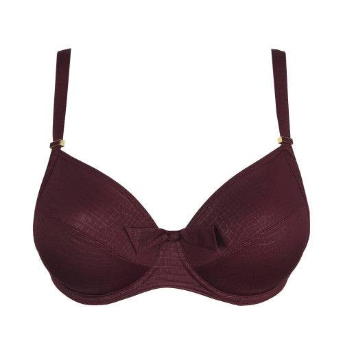 Modisches Bikini-Oberteil mit Vollschale aus einem leicht glänzenden Bademodenstoff mit Krokomuster. Die Träger sind mit goldfarbenen Details besetzt. Wine ist ein stilvoller Bordeauxton, der einen sanften Kontrast zu Ihrer Haut bildet.