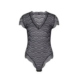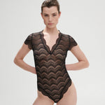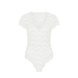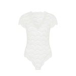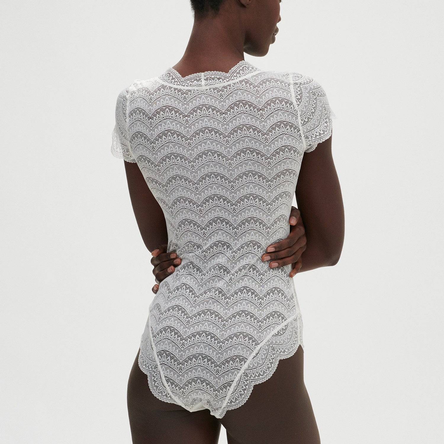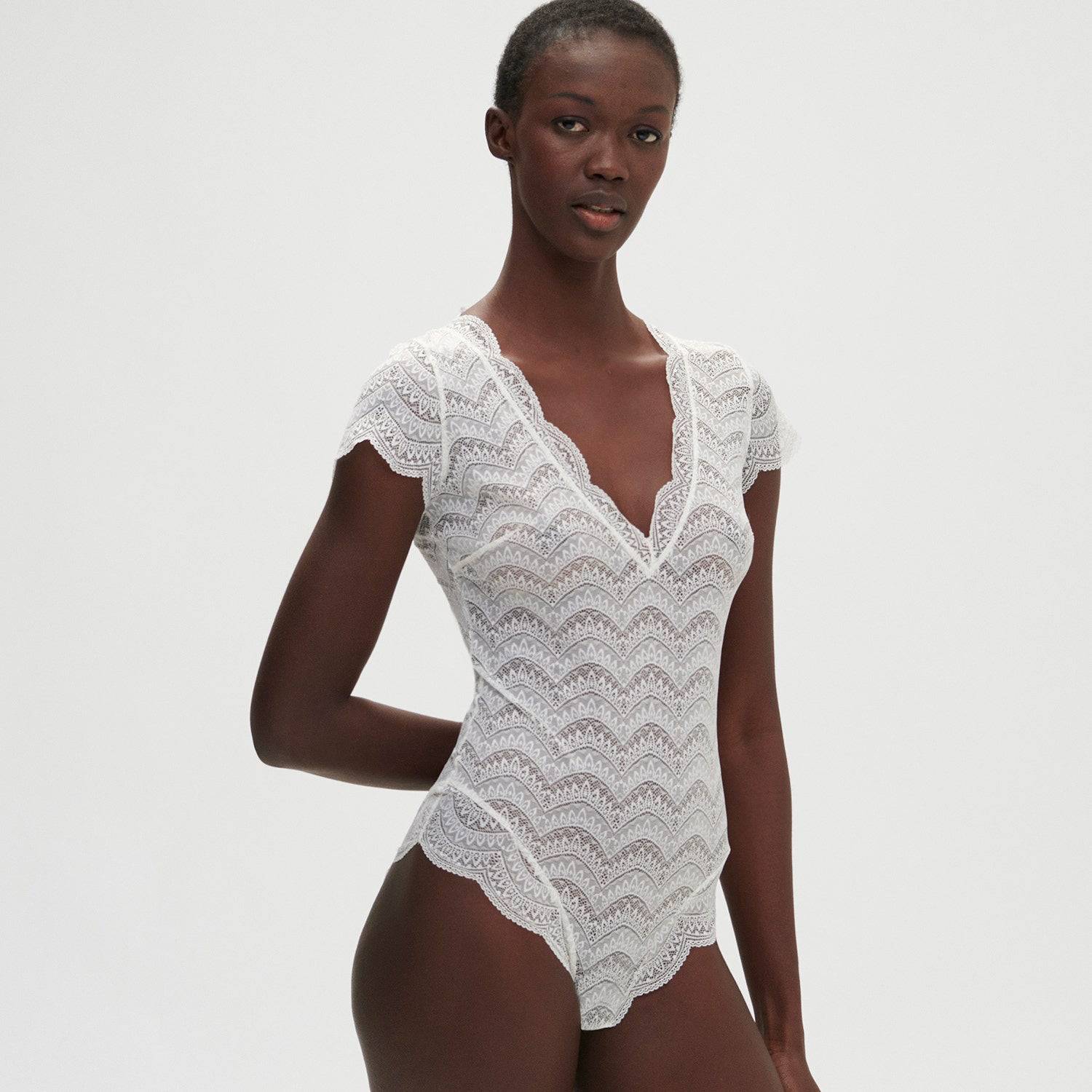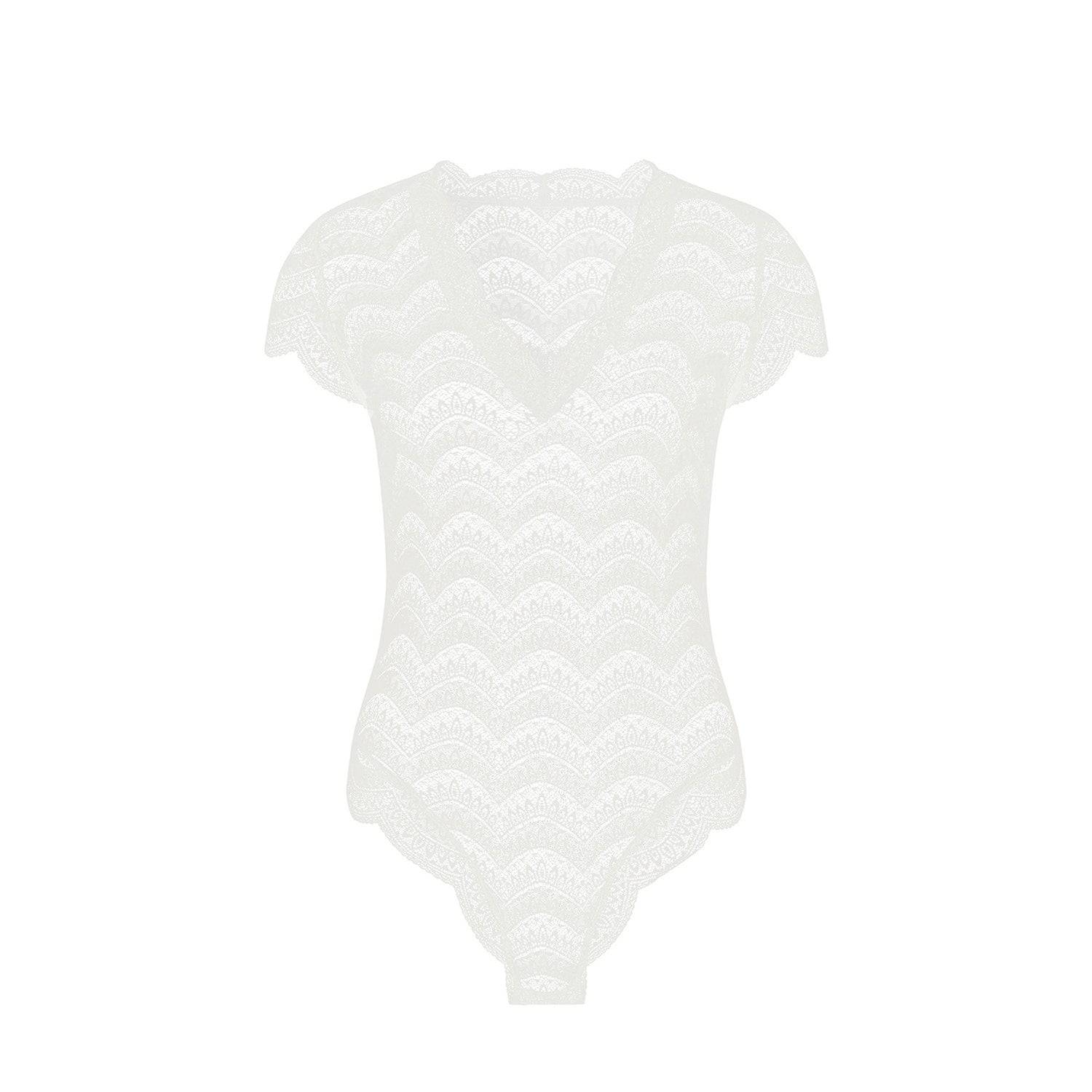 Eleganter Spitzenbody aus unserer zeitlosen Alltagskollektion mit feiner Festonspitze. Das drahtlose Design bietet maximalen Komfort ohne Kompromisse bei der Ästhetik. Das Modell besticht durch sein feminines V-Ausschnitt-Design, zarte Ärmel und einen tiefen Slip für eine schmeichelhafte Silhouette. Der praktische Druckknopfverschluss im Schritt ermöglicht mühelose Handhabung. Ein vielseitiges Piece für jeden Tag – perfekt unter Ihrer Lieblingskleidung oder als eigenständiges Statement.