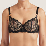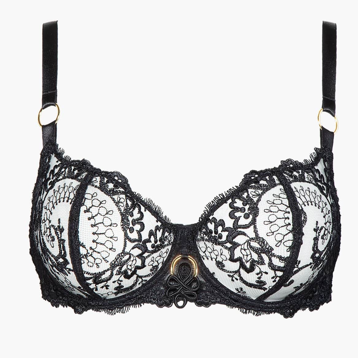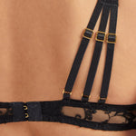 Der mythische Halbschalen-BH ist atemberaubend verführerisch. Eine abnehmbare Halskette, die mit einem kleinen Flechtornament verziert ist, bietet einen unbeschreiblich sinnlichen Anblick, und die weiblichen Kurven heben sich unter der ornamentalen Stickerei ausgesprochen verführerisch hervor. Am Rücken vervollständigen die grafischen Bänder den Glamoureffekt dieses zauberhaften Wäschestücks.