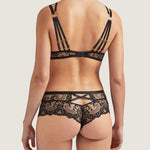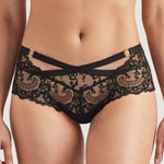 Shorty - zauberhaft breite Slip Form aus der Serie "La Reine De La Nuit" von "AUBADE" aus einer kostbaren Lycra Spitze in einem edlen Schwarz . Der Saint-Tropez Shorty erfindet sich in der verführerischen Sinnlichkeit der Reine de la Nuit ganz neu. Ein Satz grafischer Bänder, verziert mit Goldringen, enthüllt auf subtile Weise die Scham, während sich die Verzierungen der ornamentalen Stickerei um den Beinausschnitt legen.