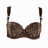Dieser traumhafte Bügel-BH mit nudefarbenen Cups wird von schwarzer Spitze umspielt, die mit floralem Motiv Ihre Brust äußerst verführerisch und feminin in Szene setzt. Die breiten, gerafften Träger mit zarten Schleifen unterstreichen den eleganten Charme des BHs, während die Bügel und komfortablen Schalen ein atemberaubendes Dekolleté formen. Der reizvolle Farbkontrast sorgt für einen sinnlichen Look und harmoniert optimal mit Ihrer Haut. Dank der abnehmbaren Träger ist der BH auch als diskreter Begleiter unter schulterfreien Oberteilen und Kleidern die richtige Wahl.