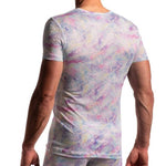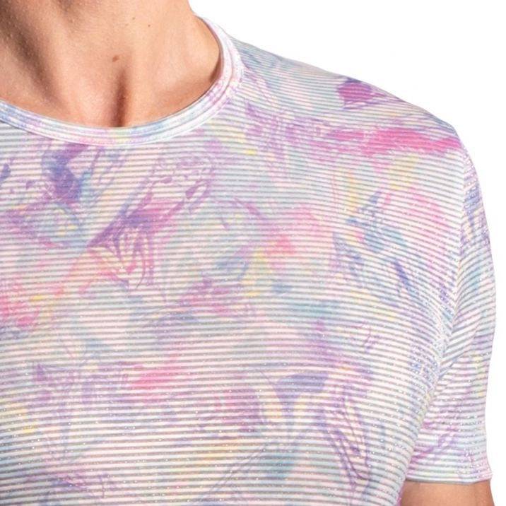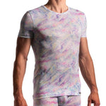 Herrlich leicht und streifenweise ziemlich durchsichtig ist die Manstore Serie M2272, zu der dieses enganliegende Casual T-Shirt gehört. Der klassische Schnitt mit kurzen Ärmeln und rundem Ausschnitt bekommt durch die verführerische Transparenz und das bunte, silbrig glänzende Ringelmuster einen spektakulären Look, der perfekt zu den Unterteilen der Serie passt.