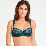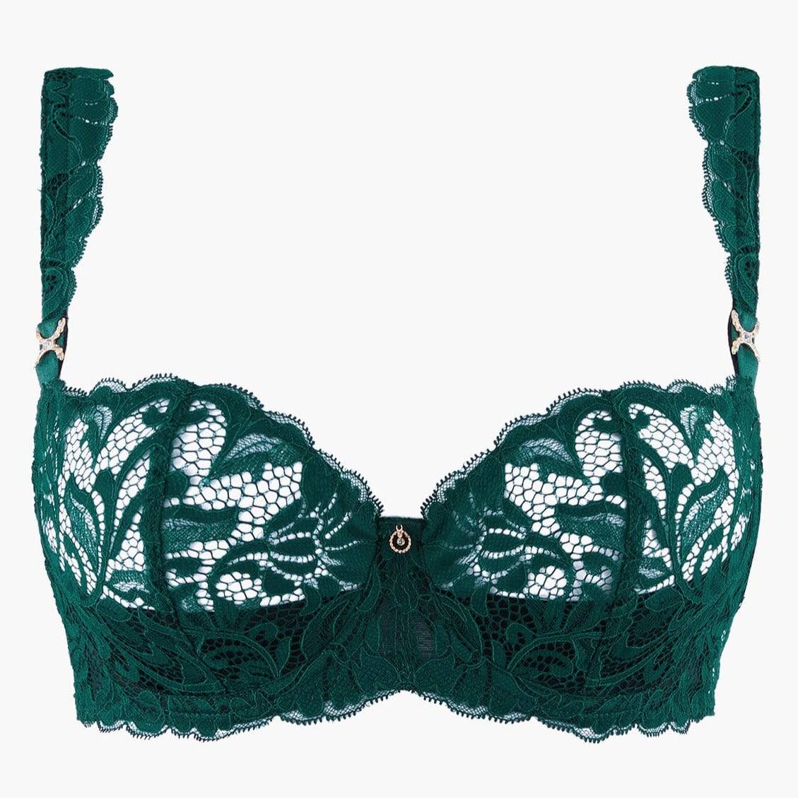 Der Halbschalen-BH der Linie Mon Bijou aus eleganter Spitze ist bis Körbchengröße G erhältlich. Die mit Plättchen verzierten Träger setzen Brust und Schultern verführerisch in Szene. Auf dem bestickten Zwischenstück funkelt ein edles und zugleich trendiges Schmuckstück aus Gold und Strass.