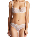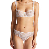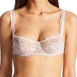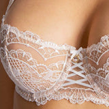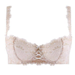 Luxuriös und sinnlich: Der Halbschalen-BH von Aubade kombiniert eine mit etwas Lurex verstärkte Spitze und Stickerei auf beigefarbenem Tüll für einen ultra visuellen Effekt. Seine Cups mit Bügel verleihen durch die besondere Schnittführung und Vertikalnähte einen sehr runden, üppigen Busen. Der Mittelsteg fällt durch eine edle Satin-Schnürung auf, gekrönt von einem Schmuckelement mit Kristall. Die raffiniert mit Spitze veredelten Trägerbänder sind in der Länge verstellbar und am Ansatz mit winzigen Satin-Schleifchen geschmückt.