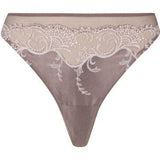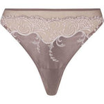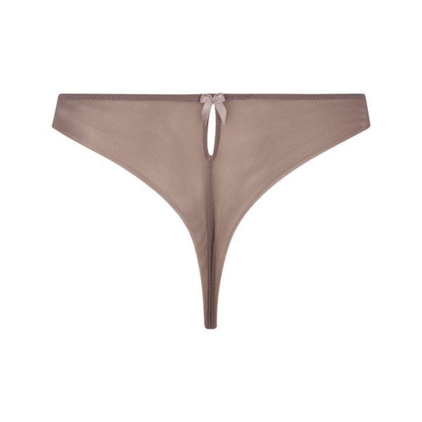 Der String hat eine Seidensatin-Vorderseite und ist mit Stickerei auf Tüll besetzt. Die Tüllrückseite ist zur Hälfte gefaltet und bietet mehr Unsichtbarkeit und hat eine zarte Satinschleife in der Mitte des Slips.